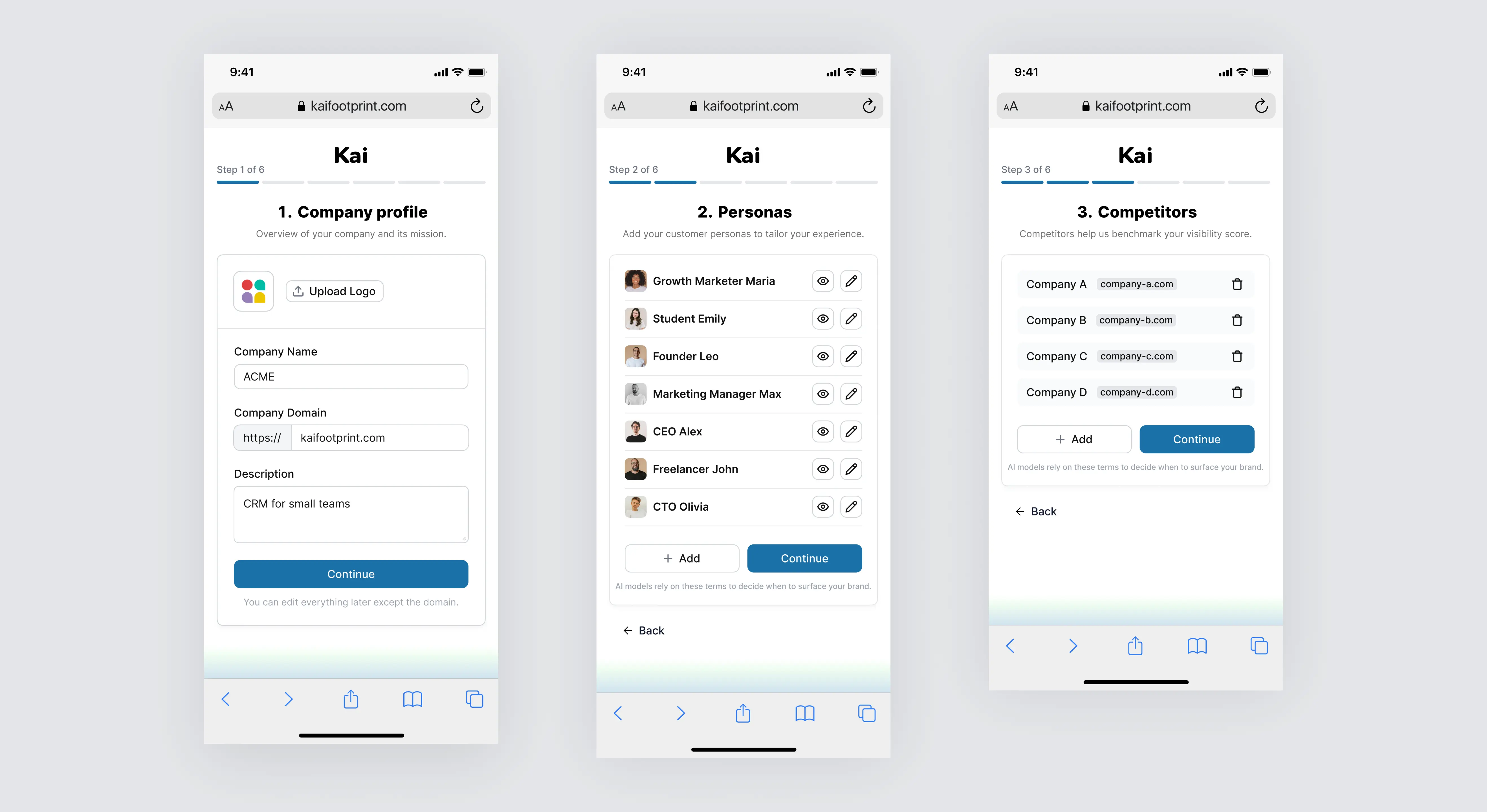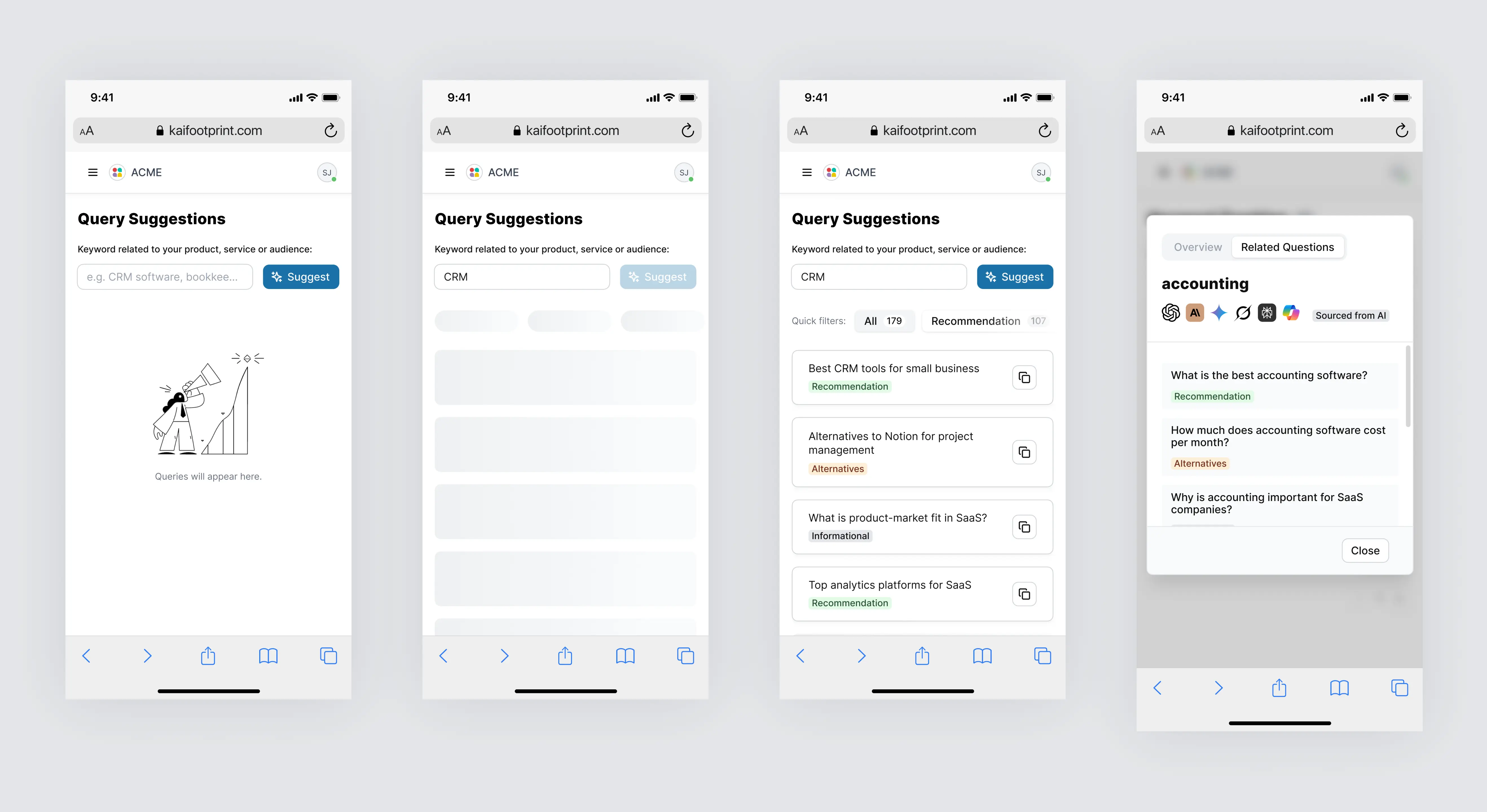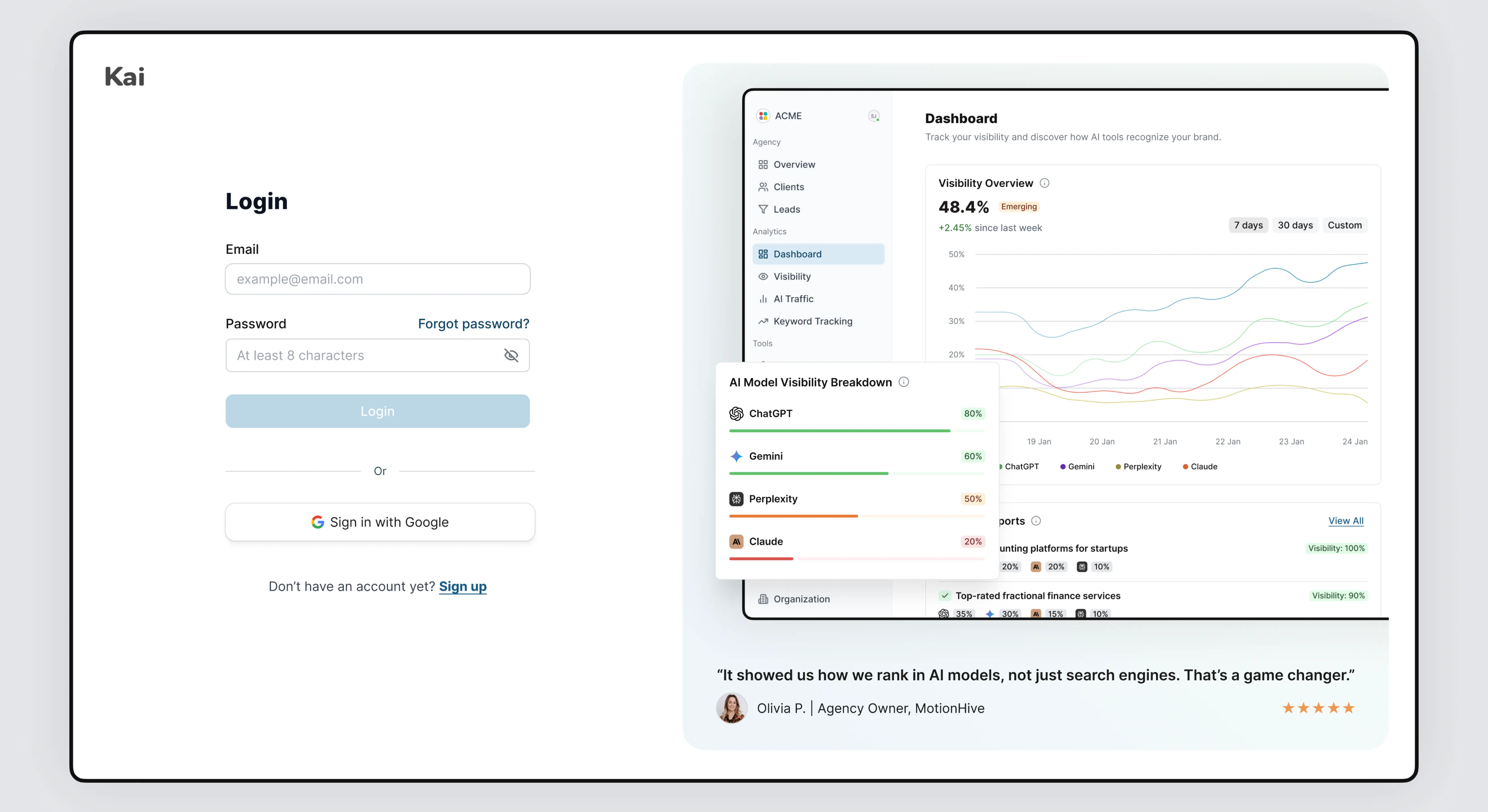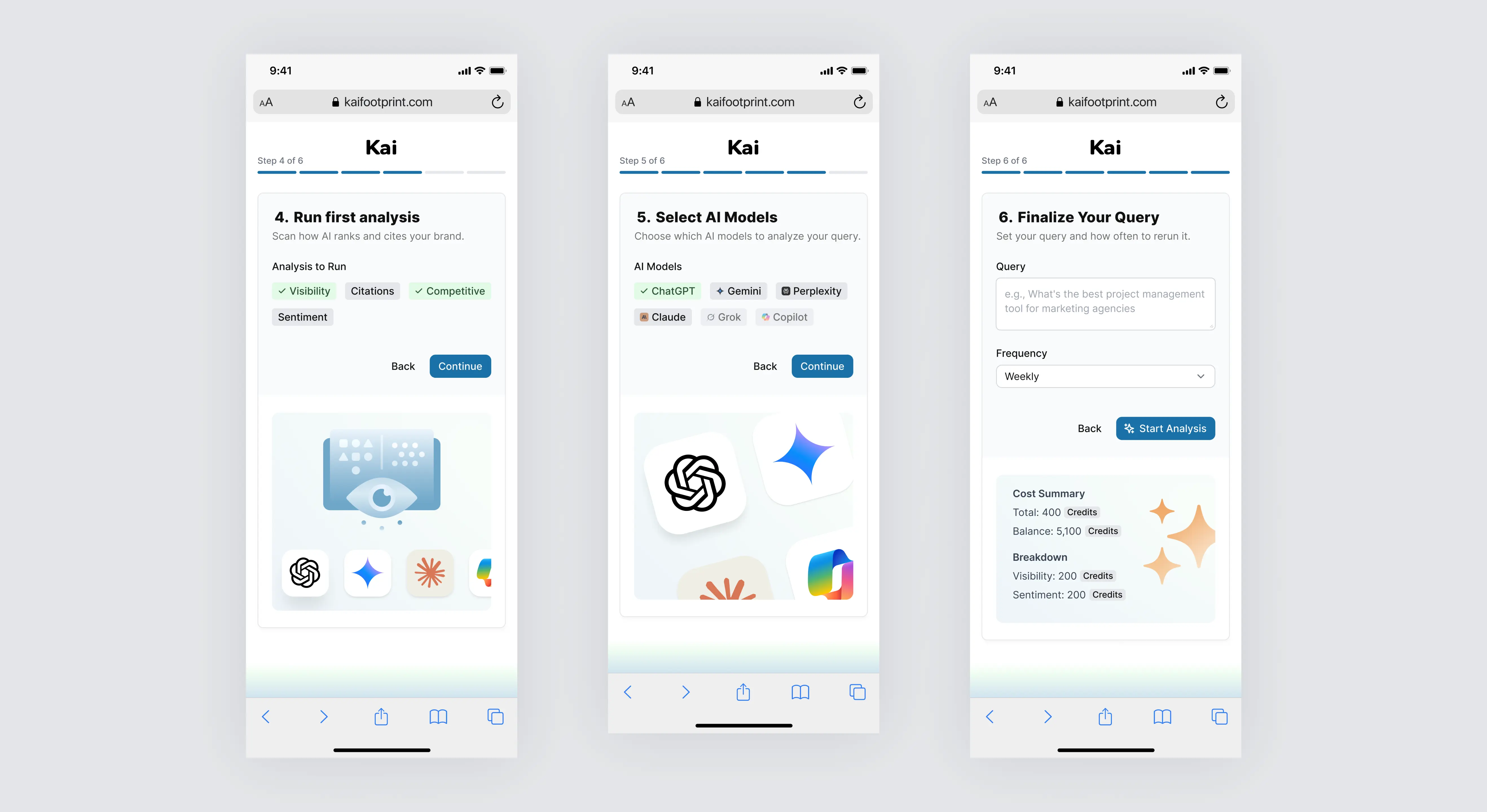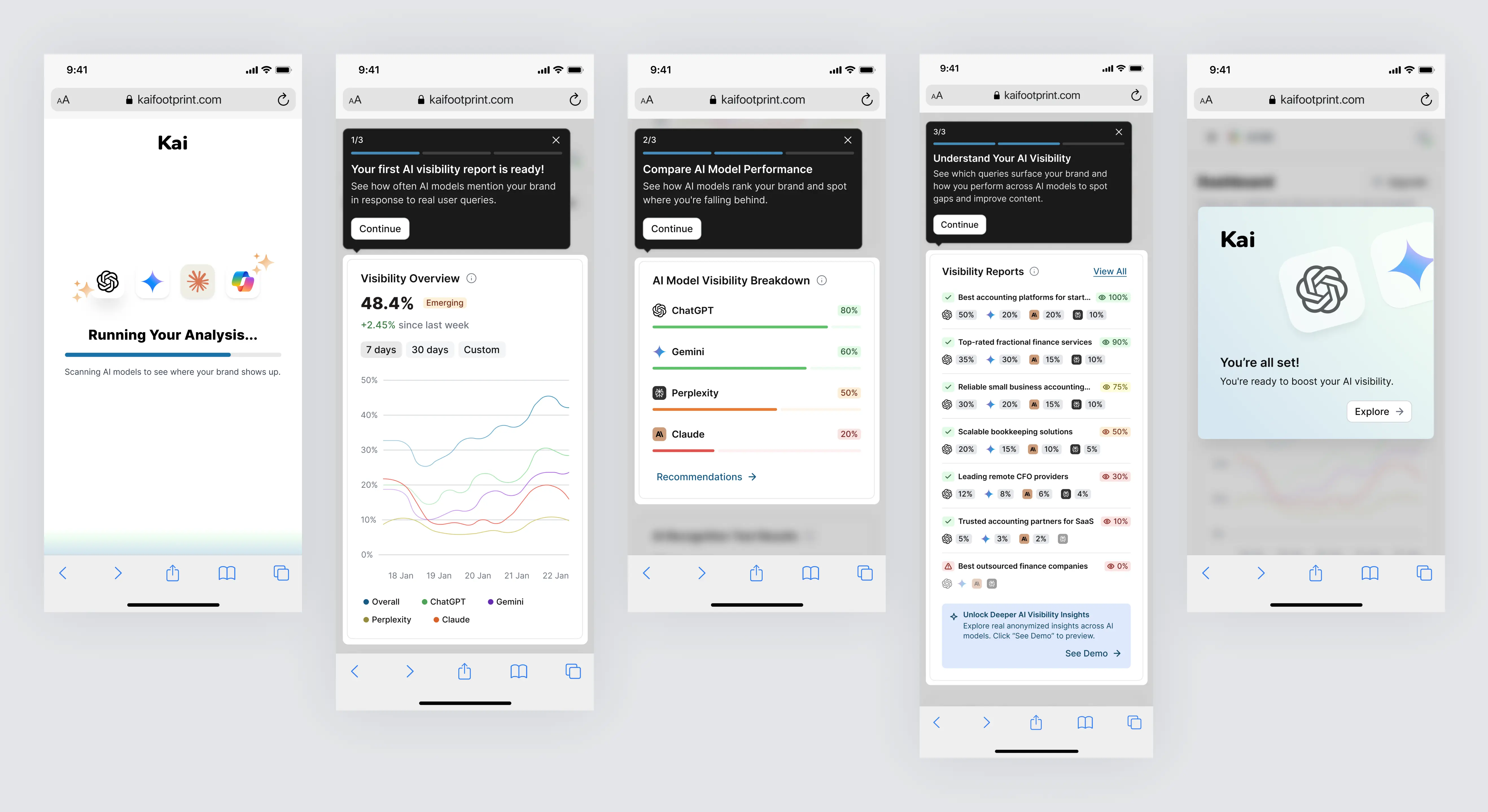 I led the end-to-end design and development of Kai, an AI SaaS platform that helps brands track their visibility across leading AI models like ChatGPT, Gemini, Claude, Copilot, and Grok. As the sole product designer, I conducted UX research, mapped user flows, built a reusable design system, and created high-fidelity designs. I also developed the entire front-end using Next.js (React), Tailwind CSS, and TypeScript, delivering a fully coded and dynamic UI with mock data, prepared for backend integration. I worked closely with the CTO and the founder to align on data structure and ensure straightforward integration.