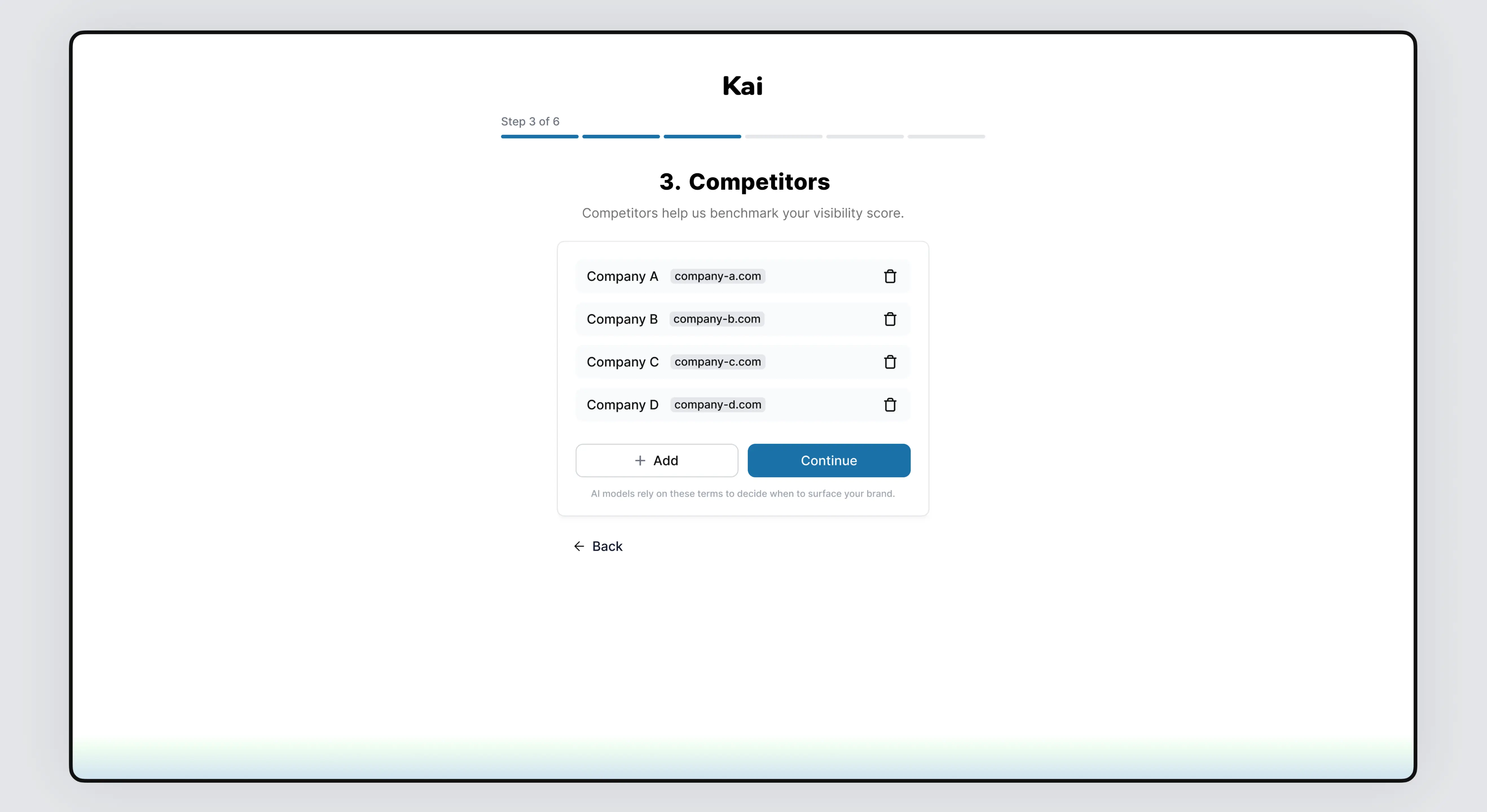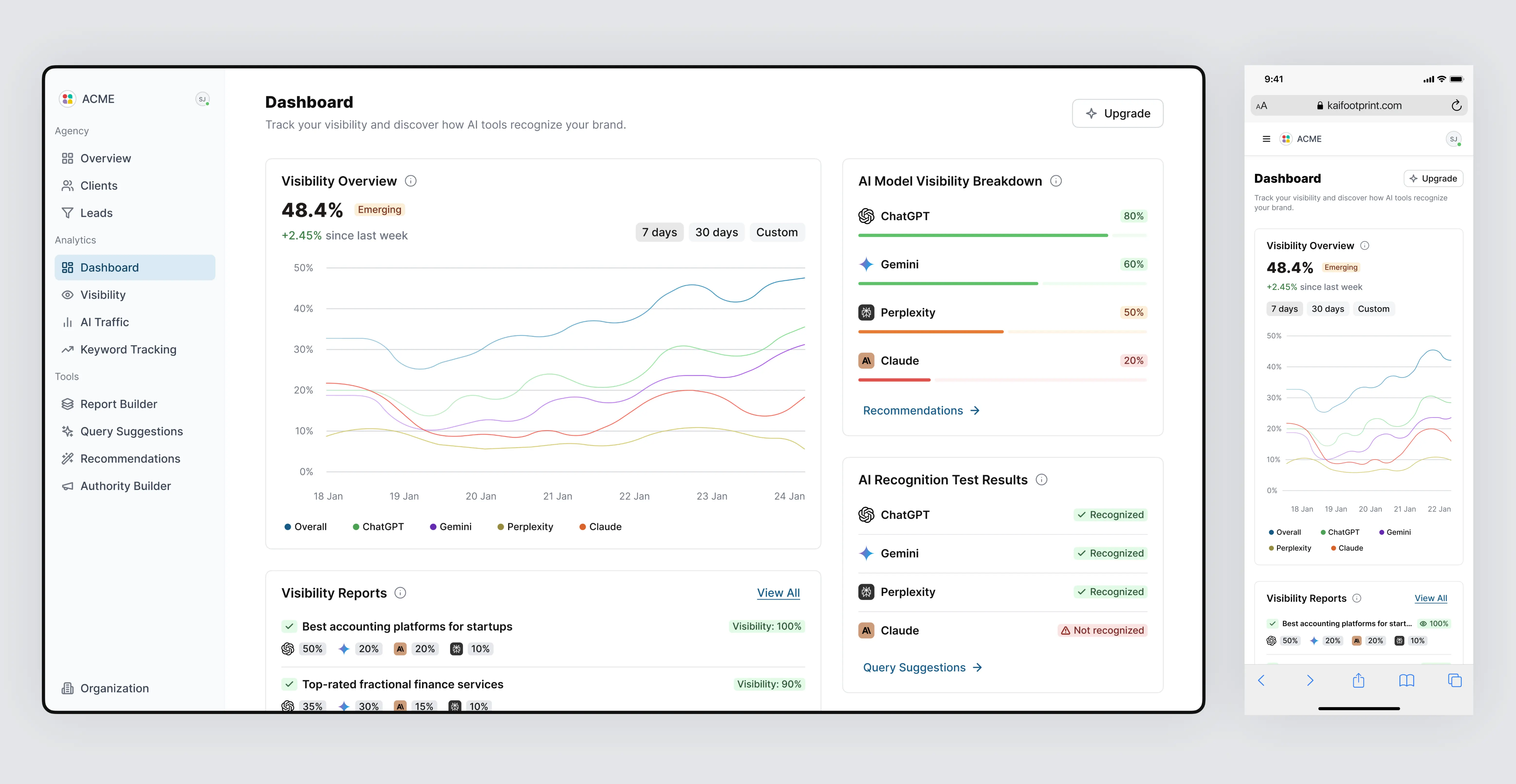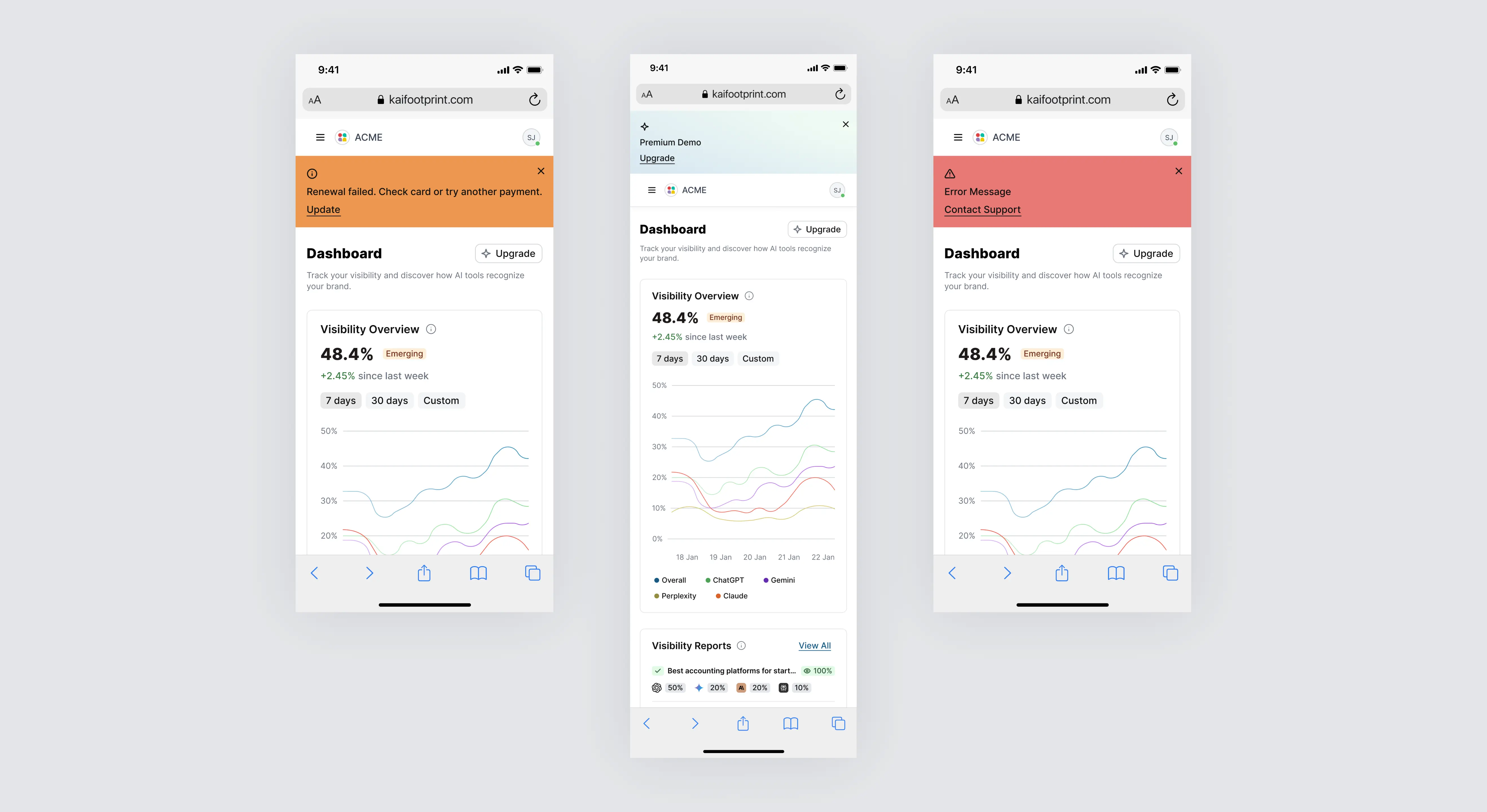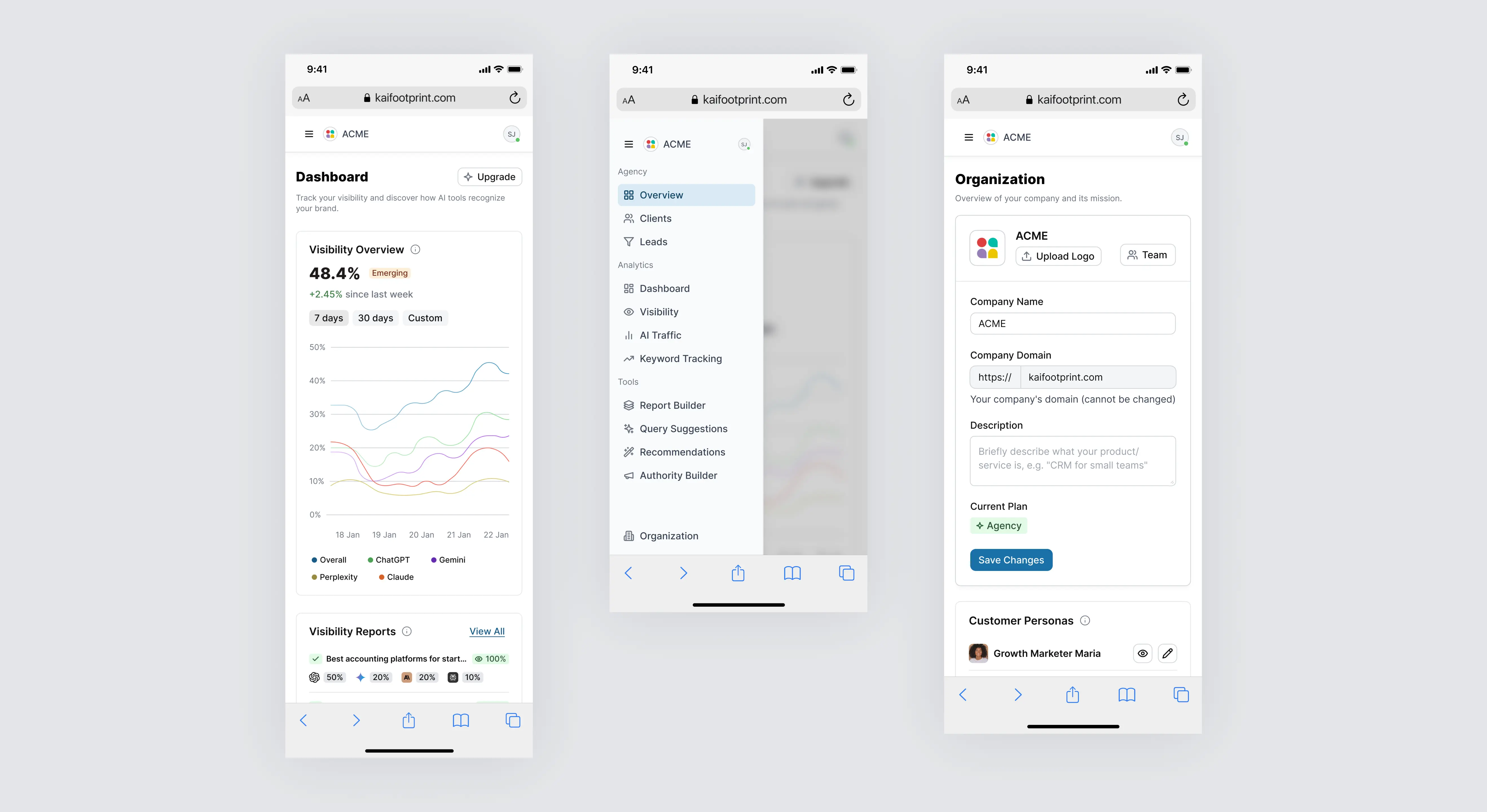 I led the end-to-end design and development of Kai, an AI SaaS platform that helps brands track their visibility across leading AI models like ChatGPT, Gemini, Claude, Copilot, and Grok. As the sole product designer, I conducted UX research, mapped user flows, built a reusable design system, and created high-fidelity designs. I also developed the entire front-end using Next.js (React), Tailwind CSS, and TypeScript, delivering a fully coded and dynamic UI with mock data, prepared for backend integration. I worked closely with the CTO and the founder to align on data structure and ensure straightforward integration.