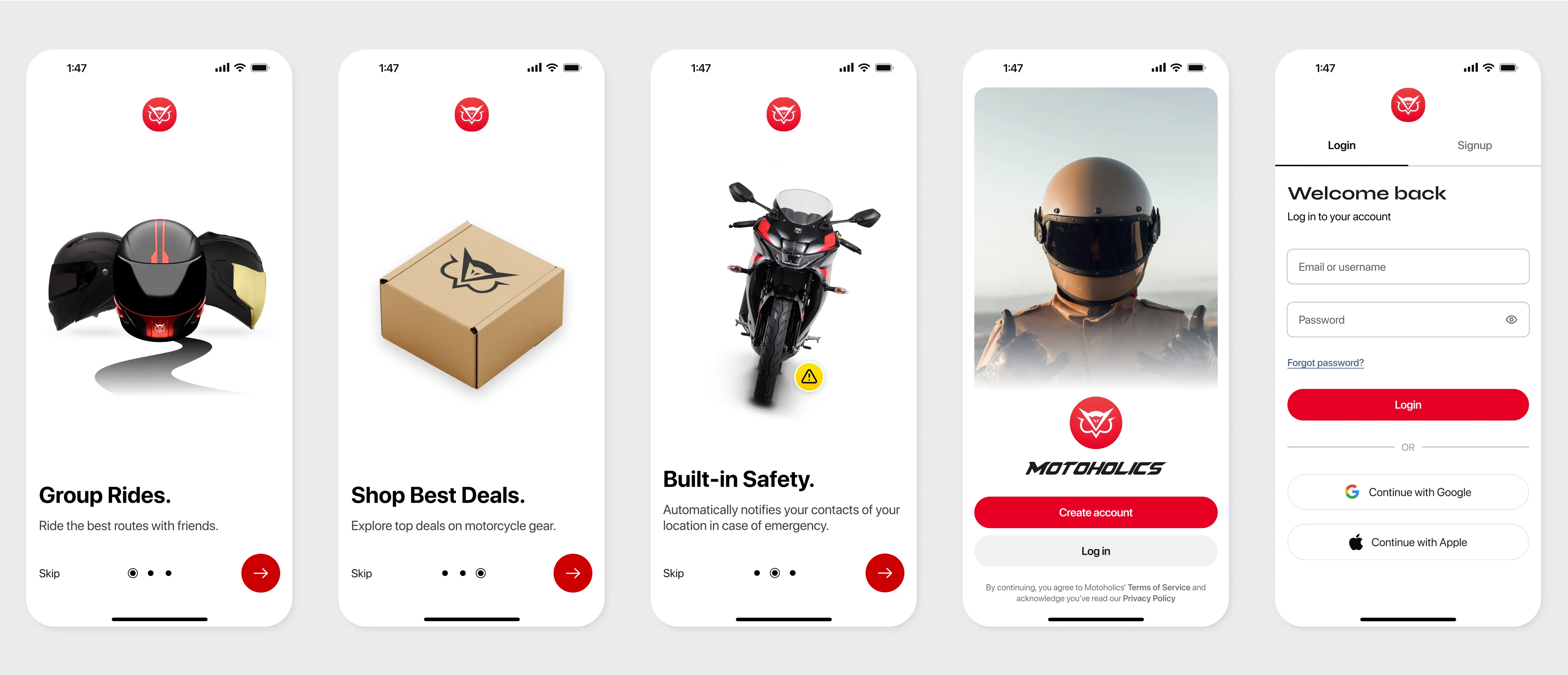 To differentiate Motoholics, I conducted a competitive analysis that highlighted unique value opportunities. By offering an integrated e-commerce platform and smart helmet integration with real-time safety alerts, Motoholics stands out as a one-stop app for riders, adding convenience and features rarely found in similar apps.