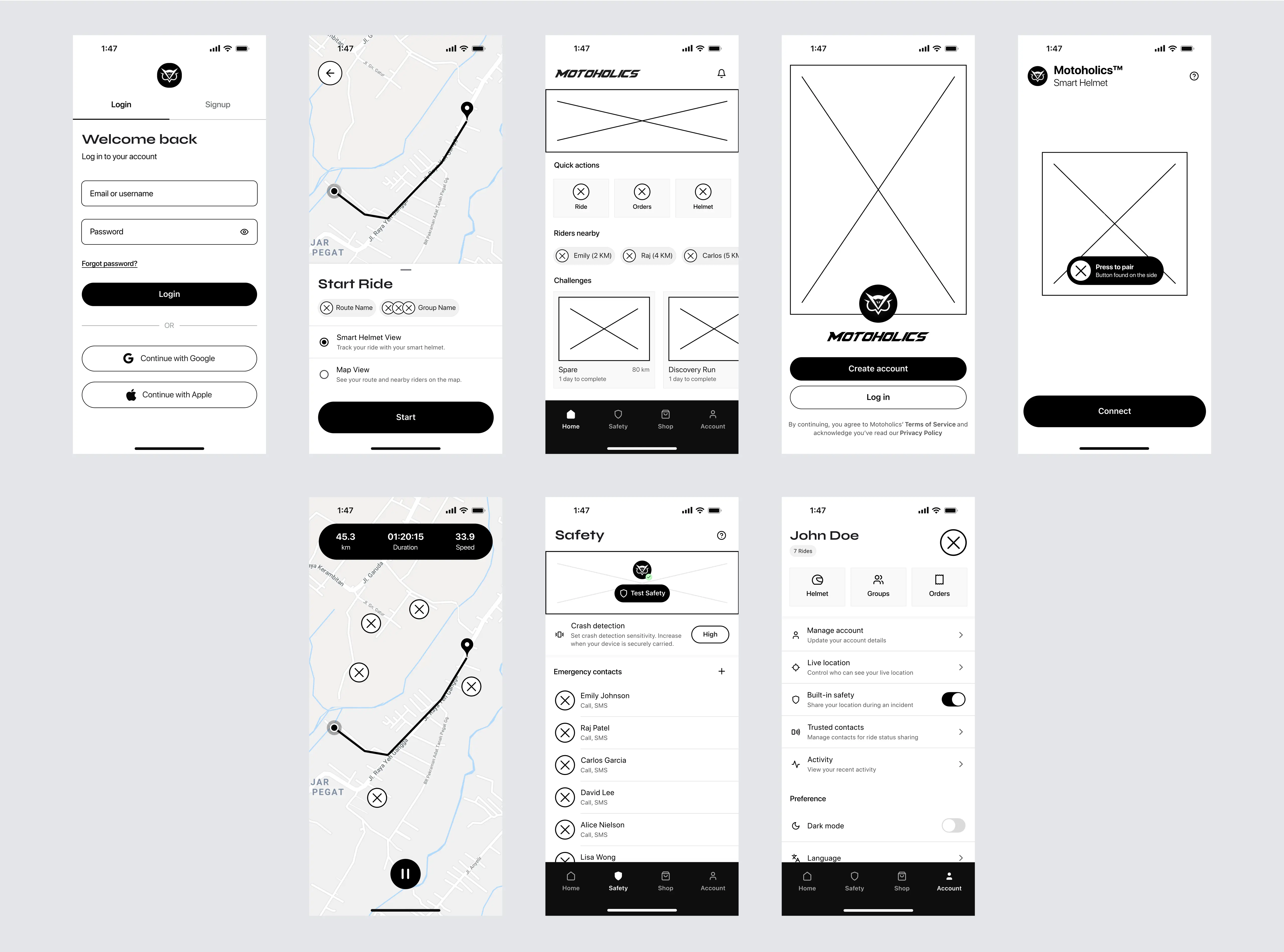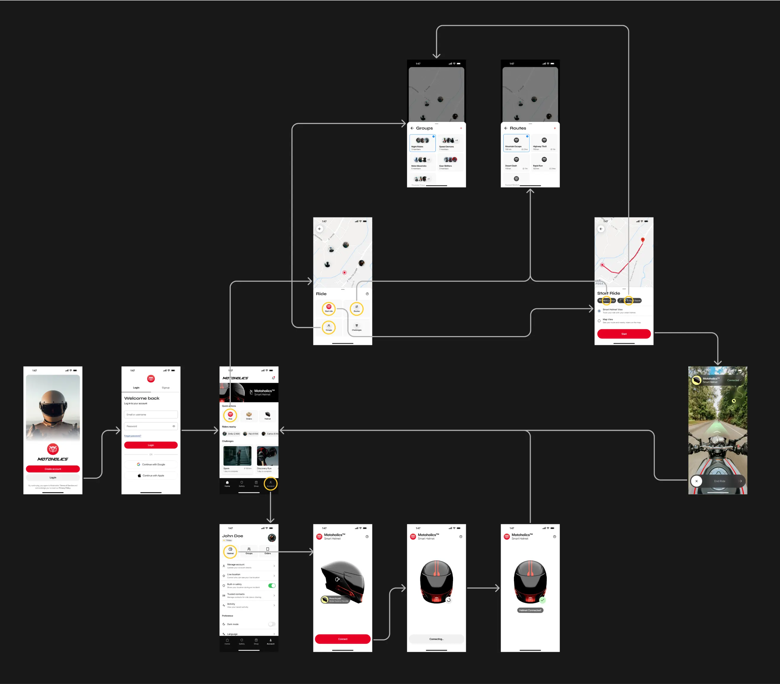 The screen flow was designed to guide users smoothly through core features, like onboarding, route planning, and helmet pairing. By focusing on task-based flows and progressive disclosure, each screen presents only the necessary information, reducing cognitive load and enhancing usability. Transitions and navigation support a clear, intuitive journey, making the app easy to use and navigate.