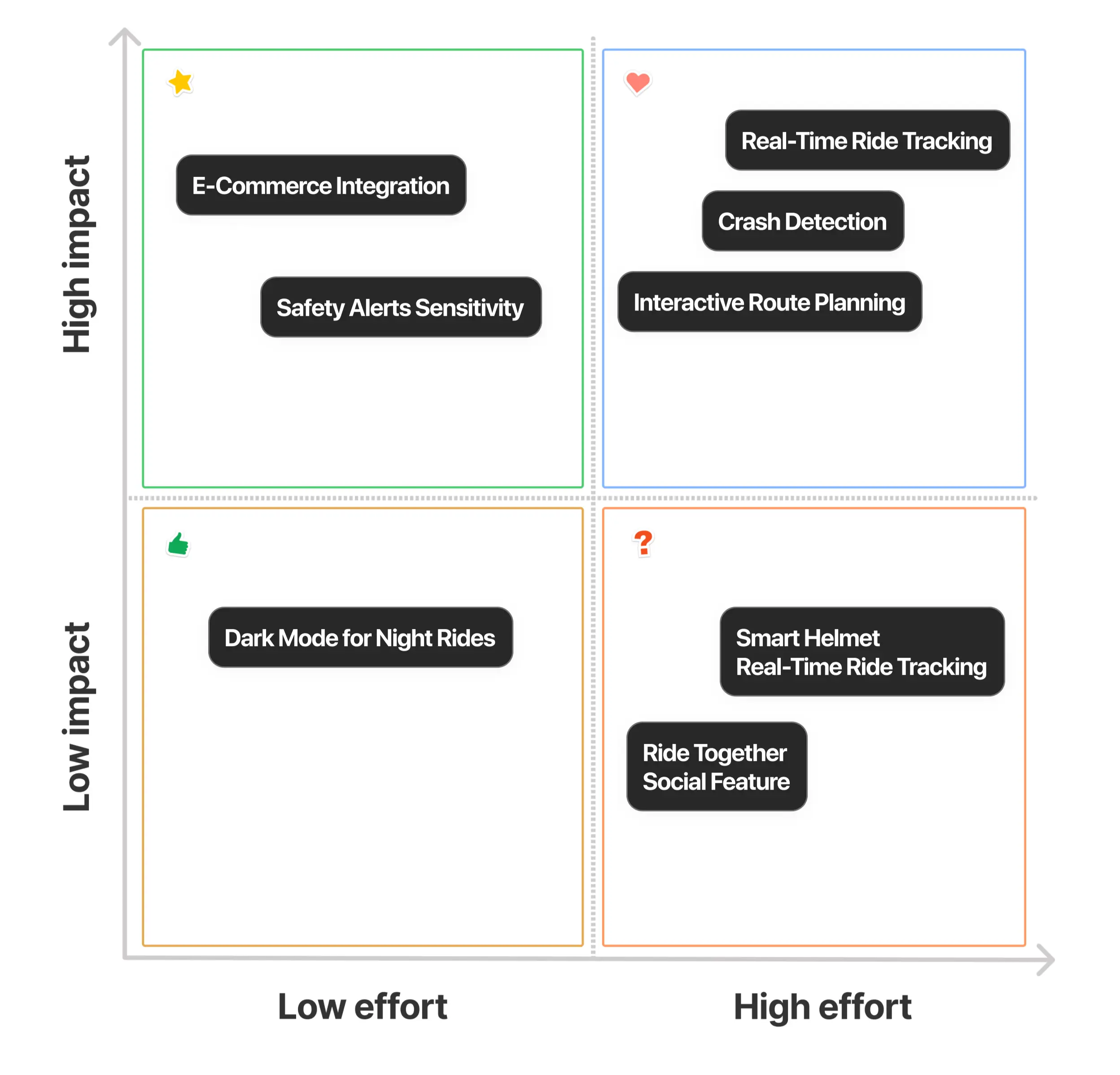For the MVP, I used an Impact-Effort Matrix to prioritize features, balancing user value with resource requirements. This method allowed us to focus on delivering the highest-impact features while maintaining efficiency and technical feasibility.